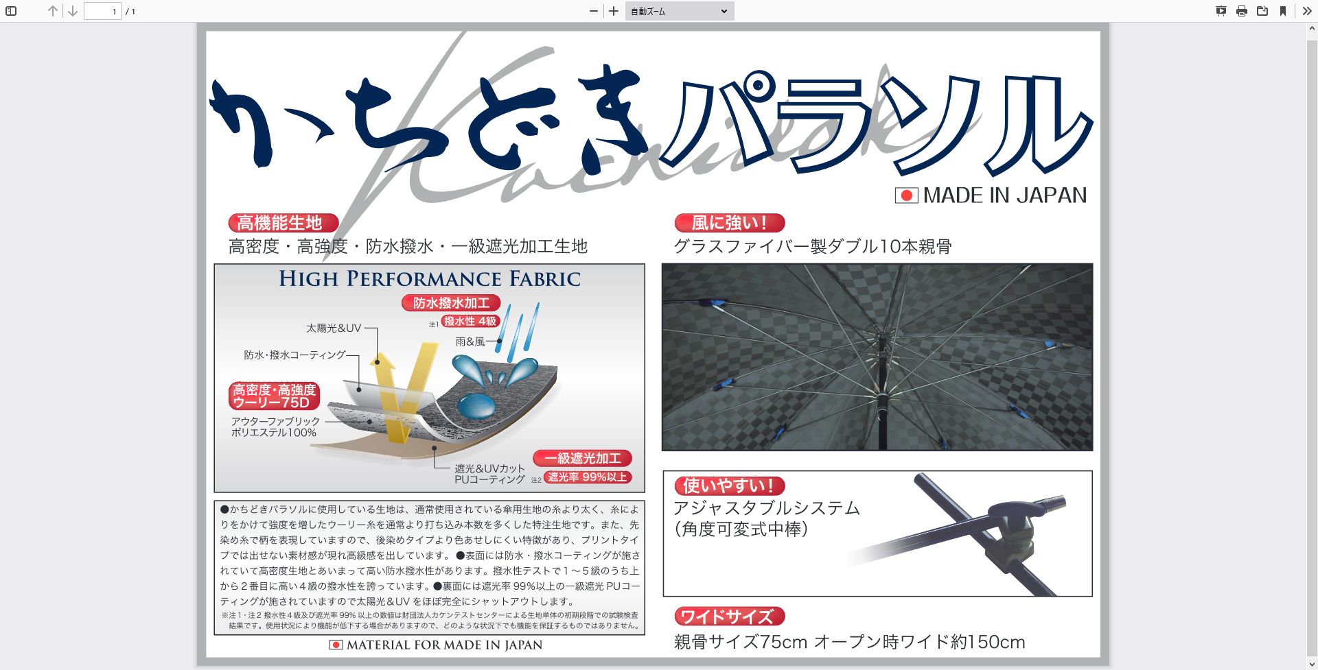 サイズ     親骨 75cm(オープン時W約135cm)