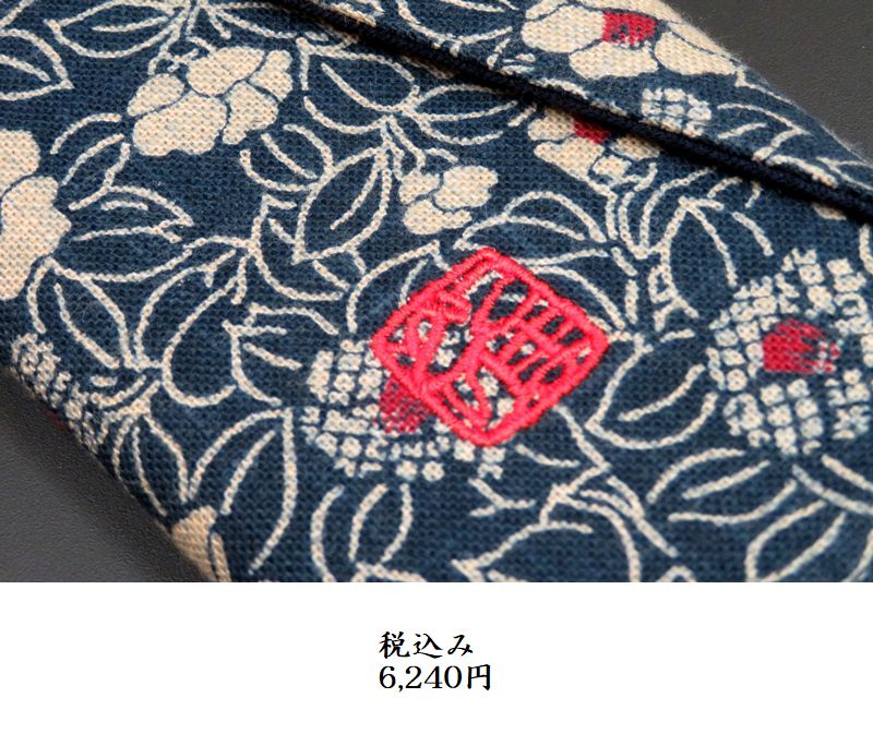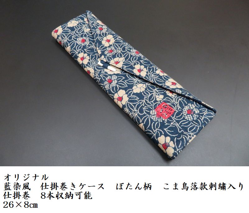 • オリジナル 藍染風  仕掛巻きケース  ぼたん柄  こま鳥落款刺繍入